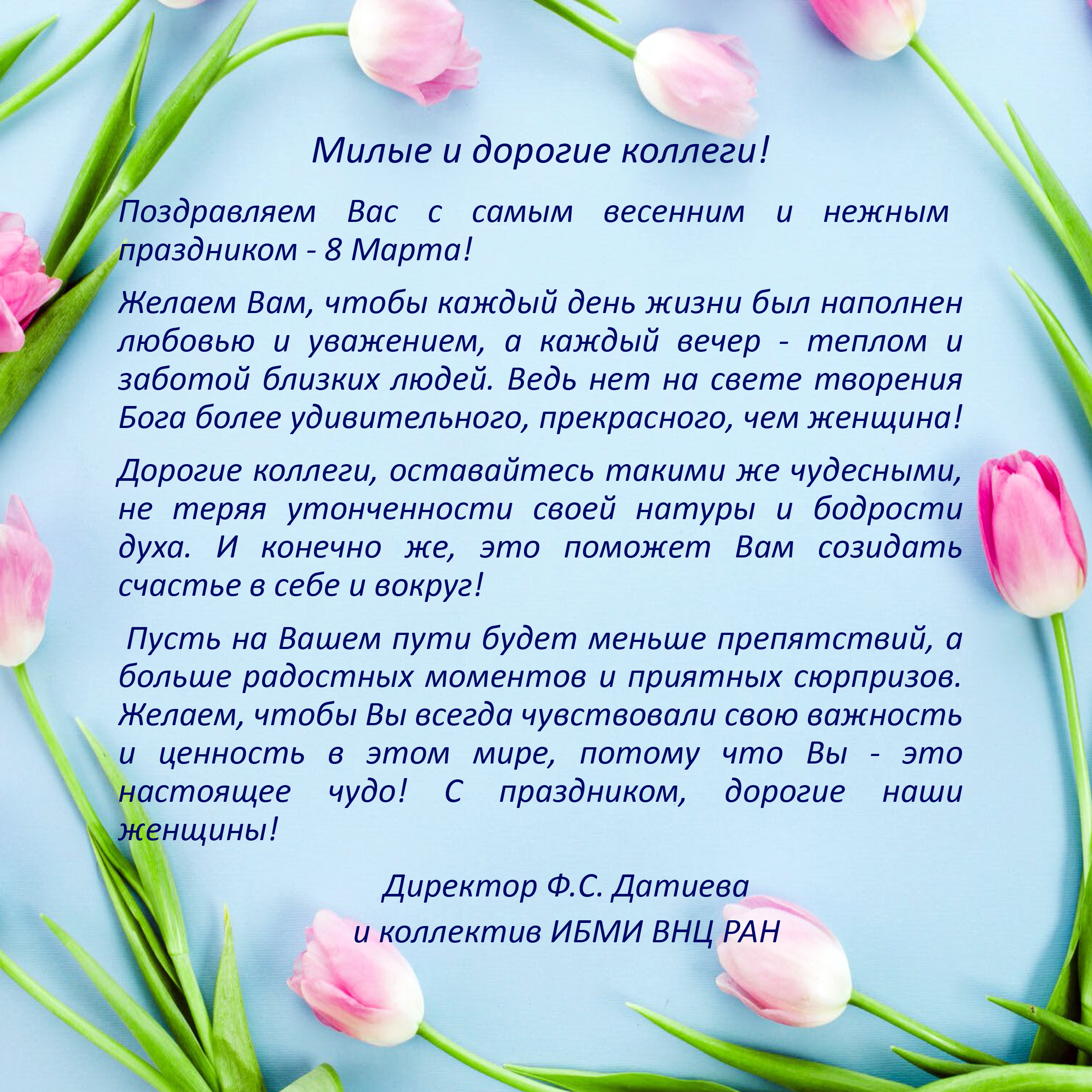От всей души желаем Вам крепкого здоровья! Интересной, активной жизни, положительных эмоций, уважения коллег! Пусть Ваши научные изыскания принесут большую пользу обществу, а Вам подарят огромное моральное удовлетворение, благополучие, радость и почет!