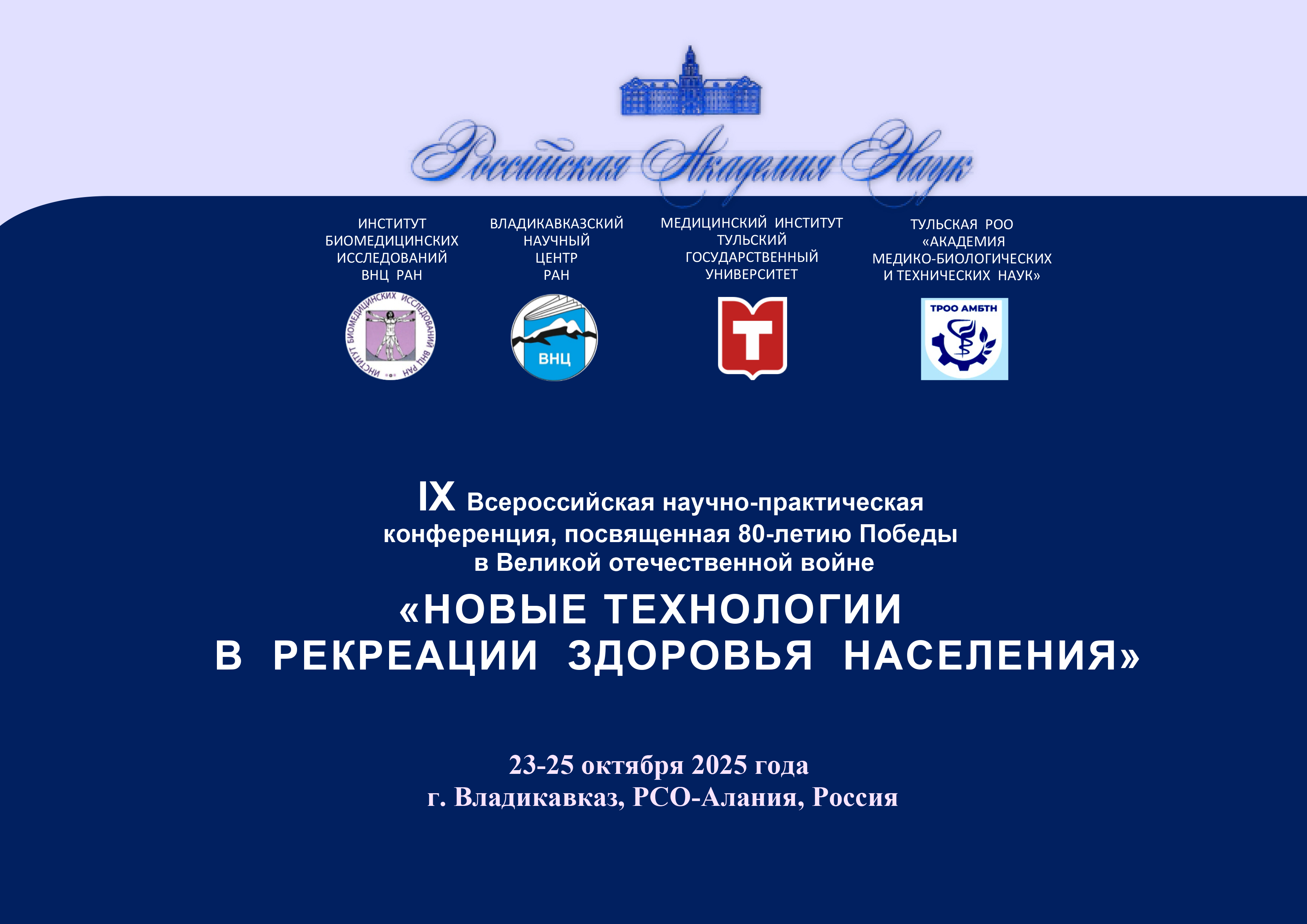 Уважаемые коллеги!  Приглашаем вас принять участие в работе IХ Всероссийской научно-практической конференции «НОВЫЕ ТЕХНОЛОГИИ В РЕКРЕАЦИИ ЗДОРОВЬЯ НАСЕЛЕНИЯ», посвященной 80-летию Победы в Великой отечественной войне.