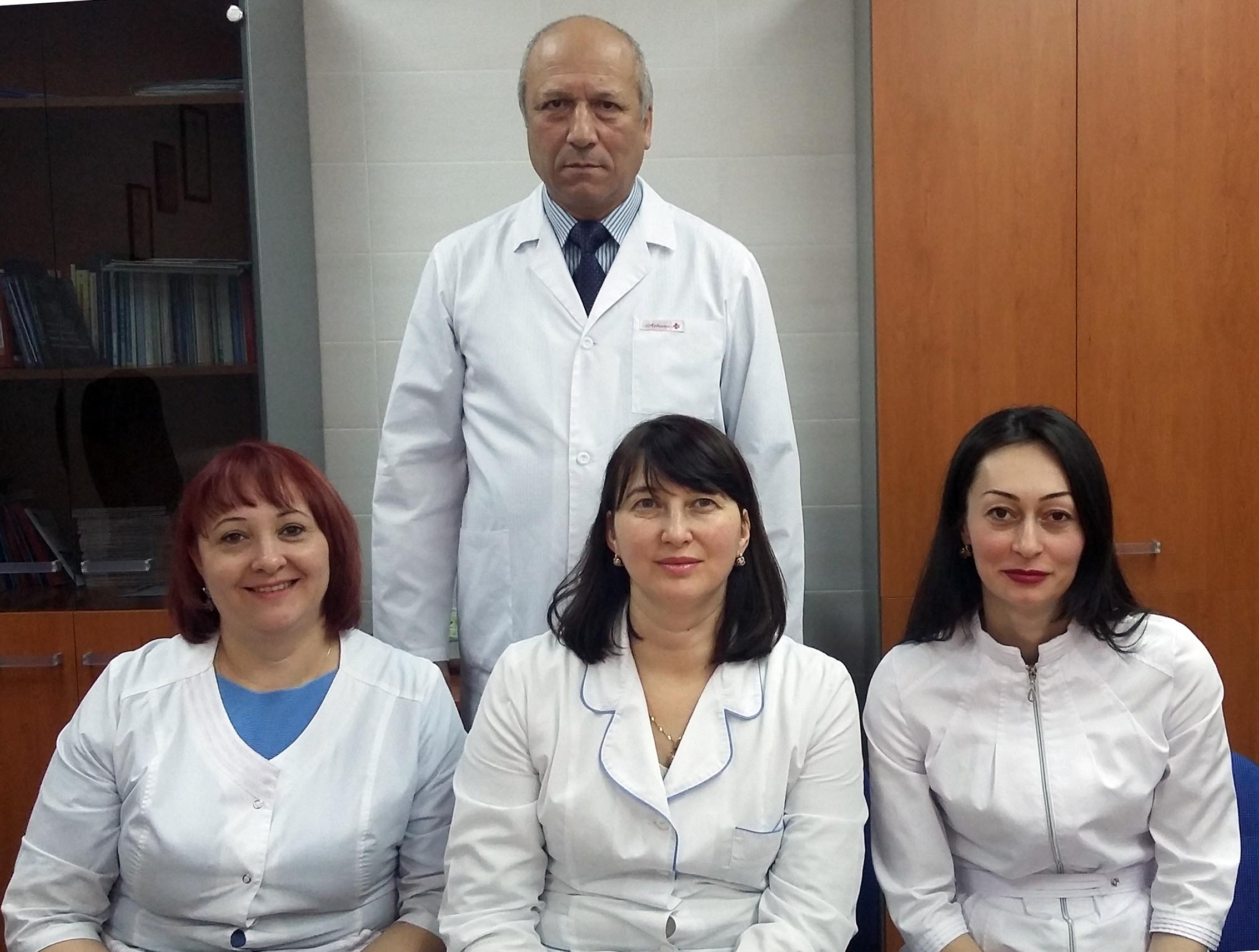 Сотрудники лаборатории (2024) слева-направо – 1 ряд: к.м.н. Л.Г. Ранюк, д.м.н. С.К. Аликова, к.м.н. Д.Я. Тадтаева, 2 ряд: д.м.н., проф., научный руководитель ИБМИ - Н.М. Бурдули