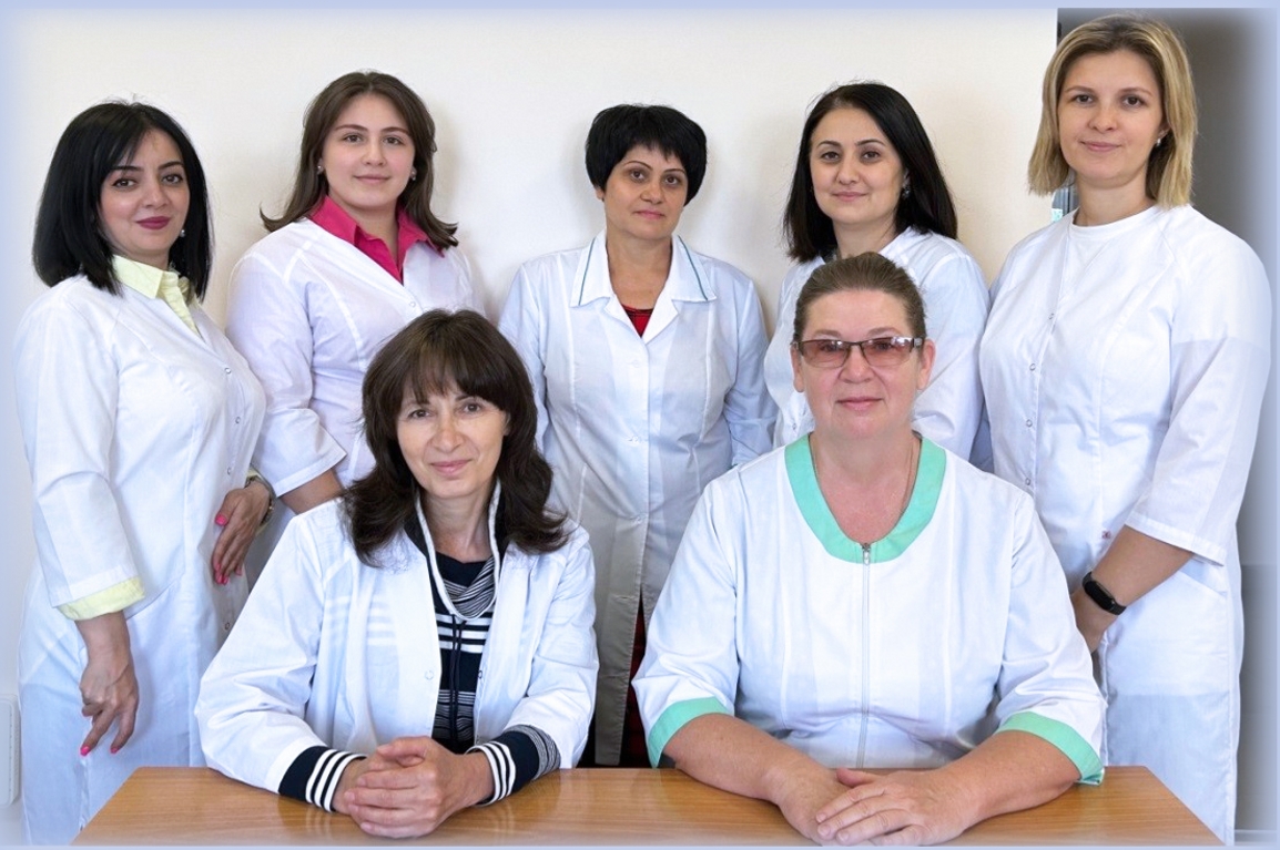 2 ряд: м.н.с. Л.А. Мерденова, к.м.н. И.Р. Тагаева, м.н.с. А.В. Базаева, д.м.н. С.А. Беляев, к.м.н. З.А. Такоева,
